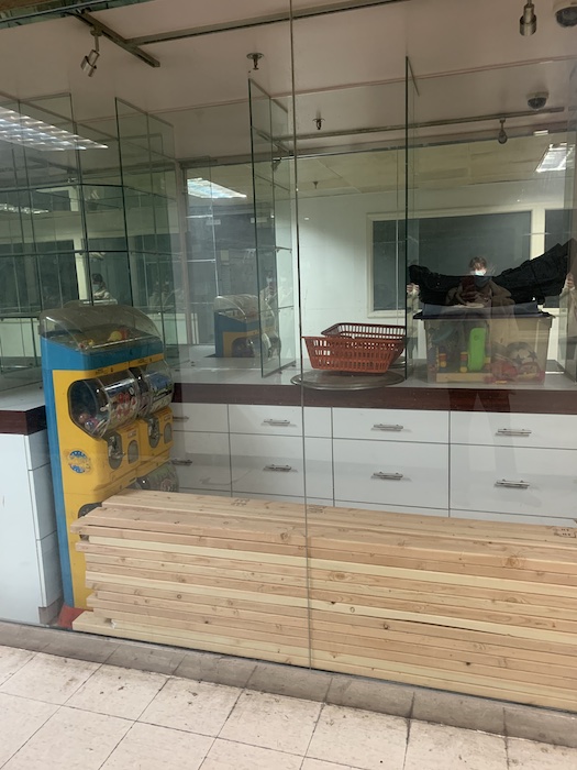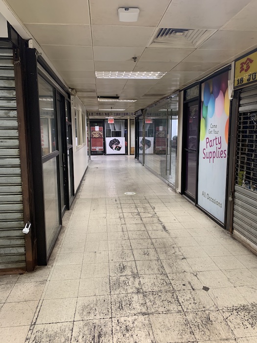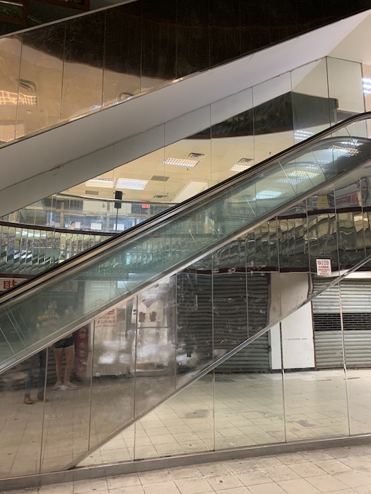 Terry, the mall’s property manager, told me earlier in the summer that the pandemic had cleared this mall out. Nearly all of the storefronts have gray shutters pulled down; some of them look like the tenant half-expected to come back. Unit #B12 has a sign asking FedEx to leave packages with their neighbor #B30. The mall’s pièce de résistance, dim sum banquet hall 88 Palace, closed in 2020. A mirrored staircase leads up to the darkened hall, a restaurant that also used to be an after-hours club.