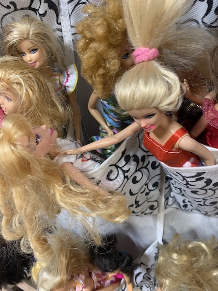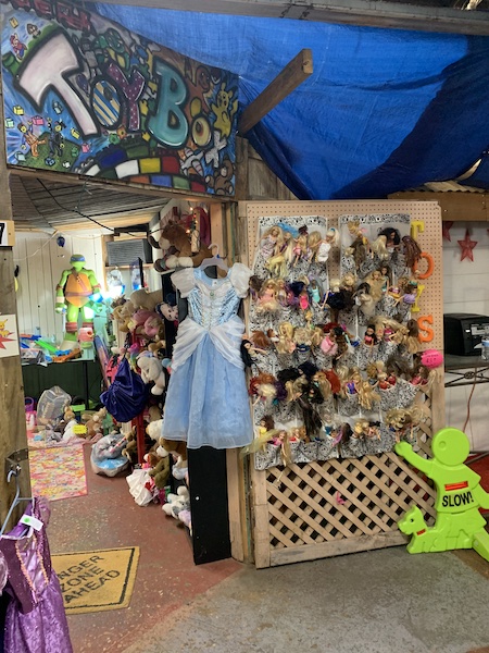 At 3:30 in a shop selling 50-cent coffee, “Tainted Love” plays. Next up, I am SMITTEN by this deranged music-festival crowd of Barbies missing heads and with smeared lipstick reaching for other Barbies’ necks. We are at The Toy Box, where there are VHS tapes, a TV to test them out, a Bunny Adoption Center, and a decent amount of Barbie accoutrements including a pink purse-shaped pillow I eye. A train whistle blows loudly out the open door a few minutes away.