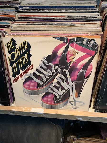 I look down and see this fabulous Pointer Sisters album. We walk out past the frenzied mannequin heads and Mexican candy stall and elote truck and leather smells. A little girl wearing dusty black cowboy boots and a red peasant blouse eats elote out of foil, a woman wearing AirPods walks to her car.