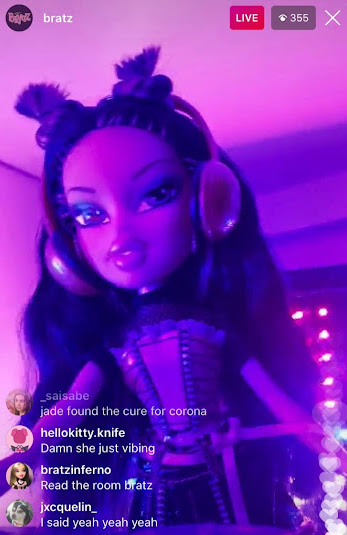 Unfortunately I couldn’t find the video — it was an ephemeral IG live — luckily I took 30 screenshots. Mid-pandemic it was such a funny fantasy escape to happen upon at night, just pure delight that me and around 400 other people were taken by. “the bratz account is on ig live rn and there’s a doll doing a dj set” someone who goes by @pigeonladybird tweeted on September 19, 2020. Comments ranged from “jade found the cure for corona” to “We all Bratz in here” to “She do be floating tho.”