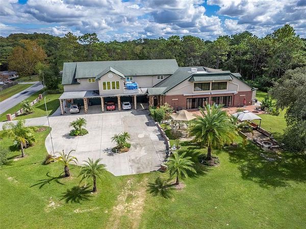You’ll also intuit that something larger-than-life is going on inside when you see the five car garages that all look like they come from different homes but also the same home. Two tiny palm tree islets sit in the middle of a concrete bay. A narrow tire path leads unceremoniously to this big, crazy house (ceremoniously). When you see the below aerial photo, it’s safe to say we can all agree that this is a plot of American soil where you can…do your own thing. Careful out there!
