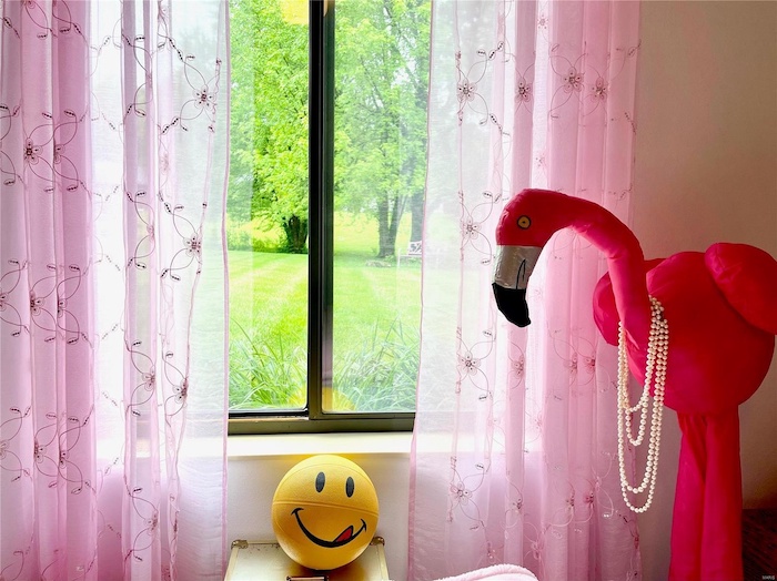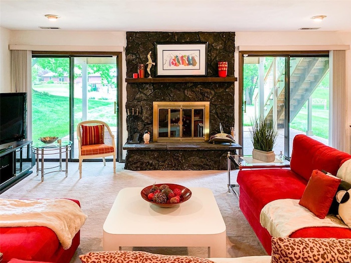 The formal dining is made for ferns and tufted chairs, and the bedrooms are simple with white walls and carpet. Dark-wood built-ins accent the basement and the master bedroom vanity, and speaking of the basement, things get a little funkier down there with a stone fireplace, carpet made to look like stones, and a giant plane mural. The backyard is bucolically Illinoian, and the pitcher on the patio is wearing a little dress. Last but not least, there is this photo of a flamingo and a smiley face.