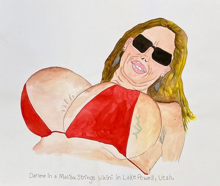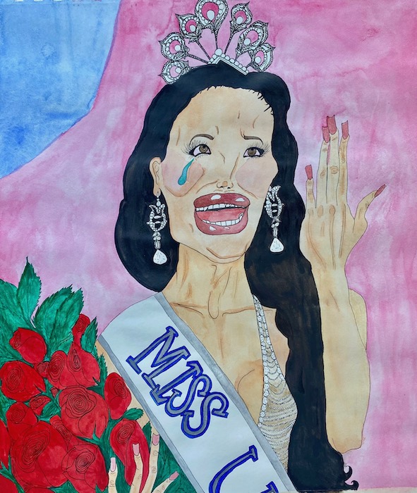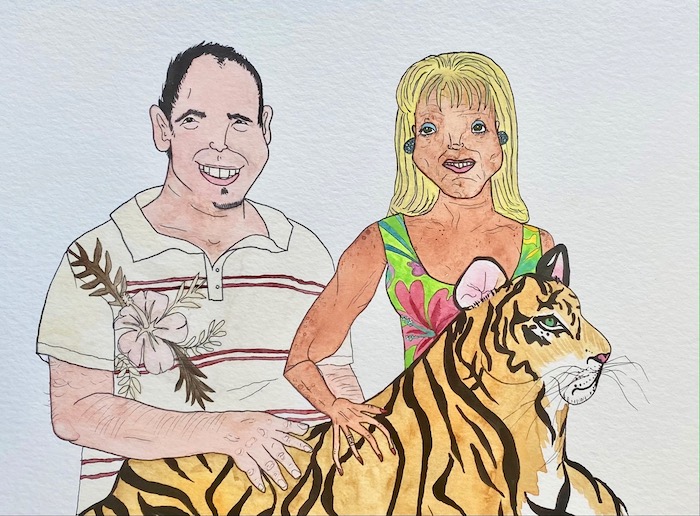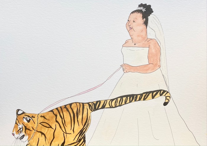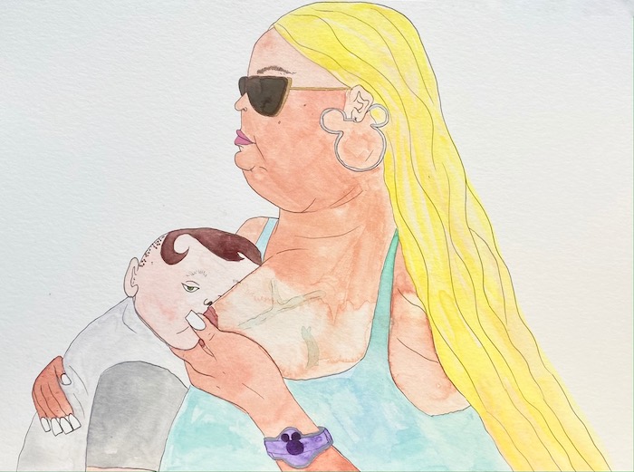 Molly is an artist born and raised in Los Angeles whose work, as their site describes, “blurs the intersection of the dreamy and the deranged.” That might mean paintings of crying Miss Universe pageant queens or people excitedly posing with tigers. “Tiger at Mall Opening” introduced me to Molly’s art through THNK1994, those curators and connectors of like-minded, obsessive pop culture associates. An interplanetary business meeting ensued! See Molly’s fantasy world and work on their site Dreamland, and be on the lookout for their upcoming art book milfs featuring paintings of (and ruminations on) bodacious, middle-aged bikini babes.