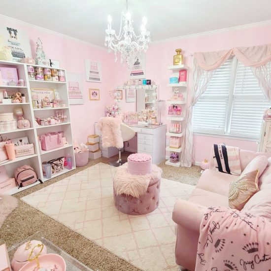 Like a lot of people in the community, Lindsay has a room in her home dedicated to pink — a “beauty room” as it’s called in the beauty YouTube world. Her husband surprised her with the remodeled guest room for Christmas last year. The origins of this collective of pink lovers are hard to pinpoint, but it seems like an offshoot of beauty YouTube with its glittering brushes and palettes. One of the original tastemakers is vlogger Stephanie Lewis, who goes by SL MissGlam. Early videos from her page showcase the girly-glam style seen in these #pinkcommunity posts. It was SL MissGlam who inspired Lindsay to create a pink room. “Once I saw her room, I knew I’ve gotta have one like that,” she says.