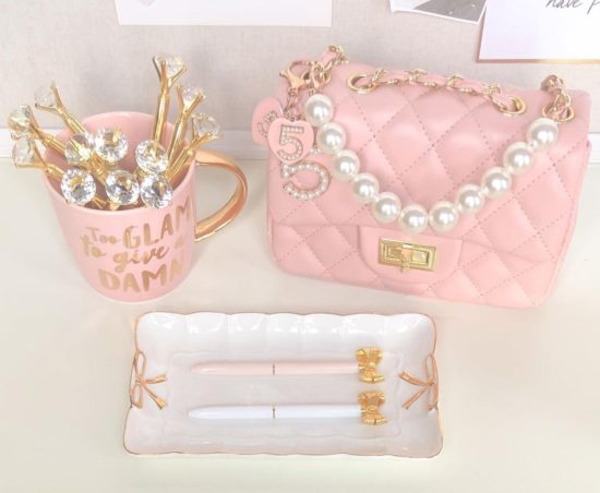 In this world, it’s pretty things only. Boxes of pink roses, Juicy Couture perfumes, macaron candles, coffee mugs with whimsical sayings in gold cursive, Victoria’s Secret wallpaper, quilted Chanel bags, pens wearing bows, sparkling makeup trays, Starbucks tumblers with Louis Vuitton logos. Every item is a shade of pink somewhere between a pointe shoe and a spoonful of Pepto Bismol.