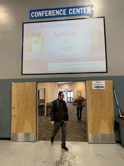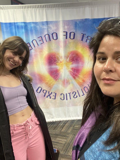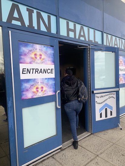 Here I was with Viviana at Heart of Oneness, an event that started (for us) as an Eventbrite link texted to me by friend of Very Famous, Annie, who lives in Austin, but has her ear to ground from coast to coast for just this kind of event. The words “Evolve, Emerge, Elevate” flourished in earthy neutrals on the brochure we were handed as we walked inside the New Jersey Convention and Exposition Center. I expected this convention center to be a corporate Edible Arrangements of big glass buildings, parking garages, Embassy Suites, a Courtyard Marriott, etc. It was, instead, a quiet older building surrounded by ambient industry — low-slung warehouse complexes for concepts like “cold chain packaging solutions”, a paving company, window installation, and News 12 New Jersey.