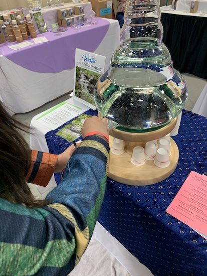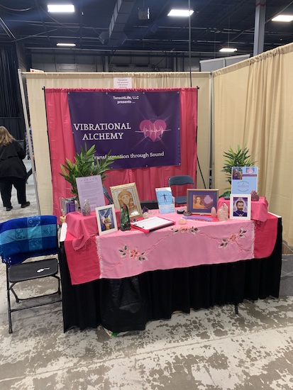 Here were the other goods and services available: spiritual healers, EFT practitioners, crystals, restructured water devices, incense, crystal-infused clothing, jewelry, tea, mandala dot paintings, myriad apothecary items, superfoods, AO frequency scanners, vibrational healing cards, aura photography, jeweled aromatherapy, aromatherapy putty, angel intention jewelry, the three S’s (soaps, salves, skincare), dream pillows, spell kits, travel altars, bells, rattles, spiritual clothing, smudging products. There was also a vendor, but just one, selling a book on the dangers of vaccines and “JFK, 9/11, The Fed, Rigged Elections, Suppressed Cancer Cures, And The Greatest Conspiracies Of Our Time”. A few other products: a bathtub fitter, popcorn made by autistic adults, empanadas, baked falafel.