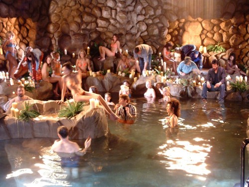 In a 2015 Gizmodo article, writer Alissa Walker examined the allure of grottos after Drake had bought the YOLO estate with a grotto that Rolling Stone described as “tricked out with a wet bar, illuminated wading pools, flat-screen TVs, and a dozen other details that take time to fully register.” Walker refers to grottos as the “wet dreams of the nouveau riche,” a moisture and sex-infused dank place with its modern popularity tracing back to the Playboy Mansion grotto. The Playboy grotto was designed and built by a Chicago design team and couple Suzanne and Ron Dirsmith in 121 days. “Upon entering the Grotto, visitors tend to be surprised by the variety of the sources of pleasure they encounter,” the Dirsmiths wrote in WaterShapes magazine. The three obscured entrances of the “play space” worked together to “lend an air of mystery to the space while giving it an otherworldly glow.”