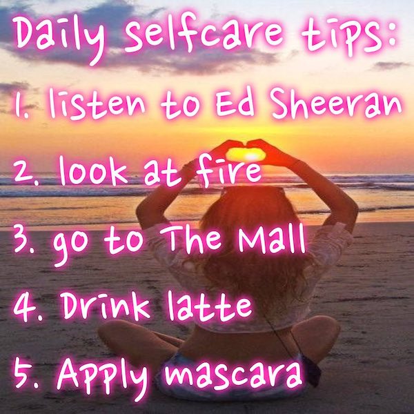 Yeah. There’s this picture that says, “Yes, I’m crazy but I’m free.” Everyone has their own problems, and I struggle with anxiety myself. Talking about this in such a way where I can make fun of it, it really helps me a lot. I made a “daily self-care tips” post that says, “Look at fire, go to the mall, apply mascara, drink latte, listen to Ed Sheeran.”